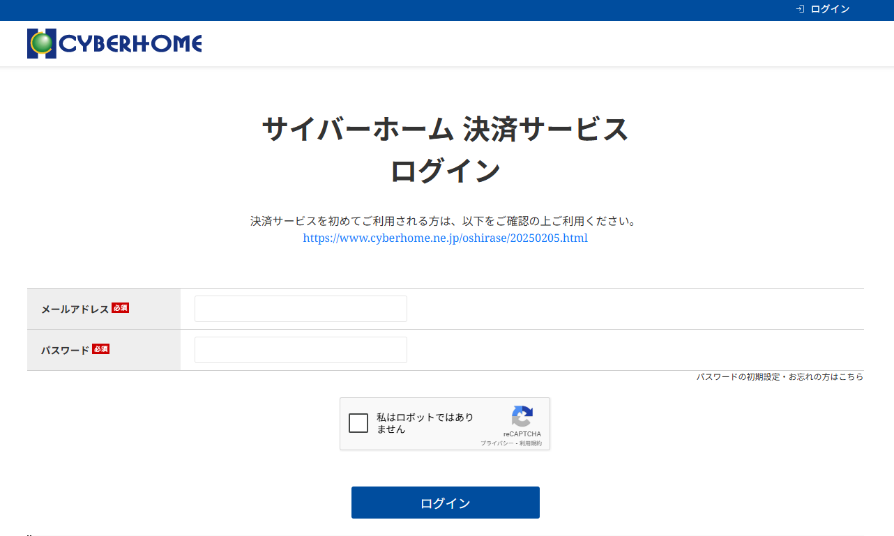 ②サイバーホーム 決済サービスログイン>「メールアドレス」、「パスワード」を入力の上、「私はロボットではありません」にチェックし、ログインを選択する。