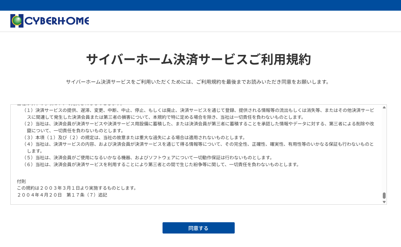 ③サイバーホーム決済サービスご利用規約をお読みいただき、「同意する」を選択する。
