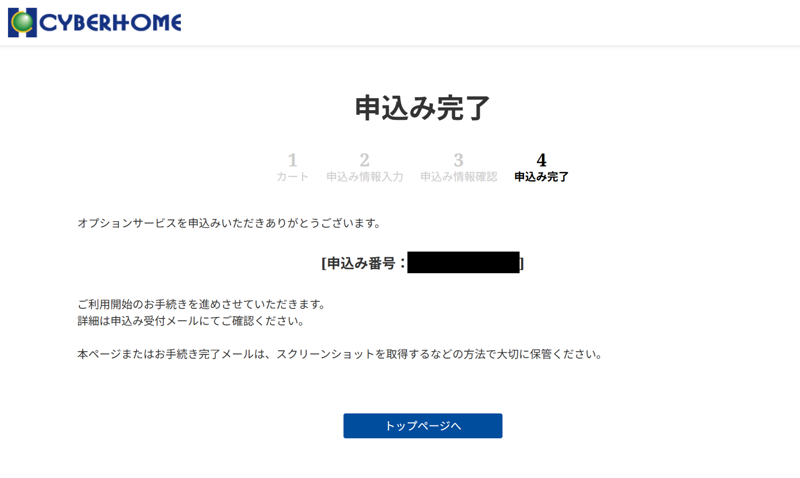 ⑪申込み完了>「申込み番号」が表示されれば完了。(オプションサービスによって利用開始の時期等が異なります。詳細は「メール件名:【サイバーホーム】オプションサービス申込み受付のお知らせ」をご確認ください)